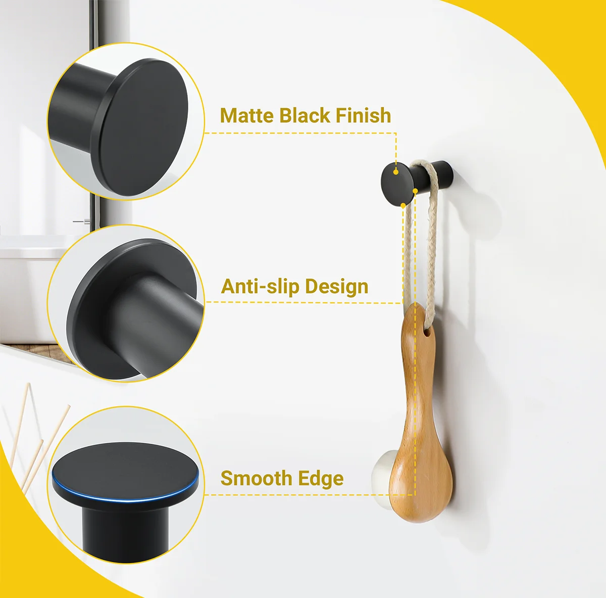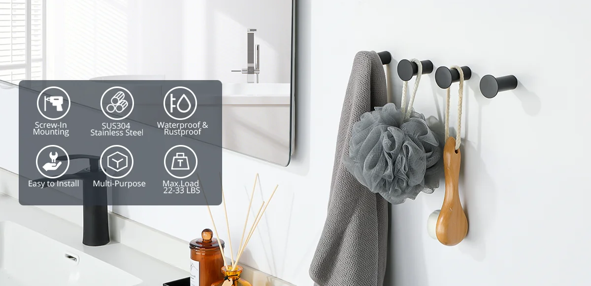 4pcs Robe Hook Bathroom Towel/Coat Hook Wall Mounted Door Hooks Heavy Duty 304 Stainless Steel Matte Black Bathroom Accessories