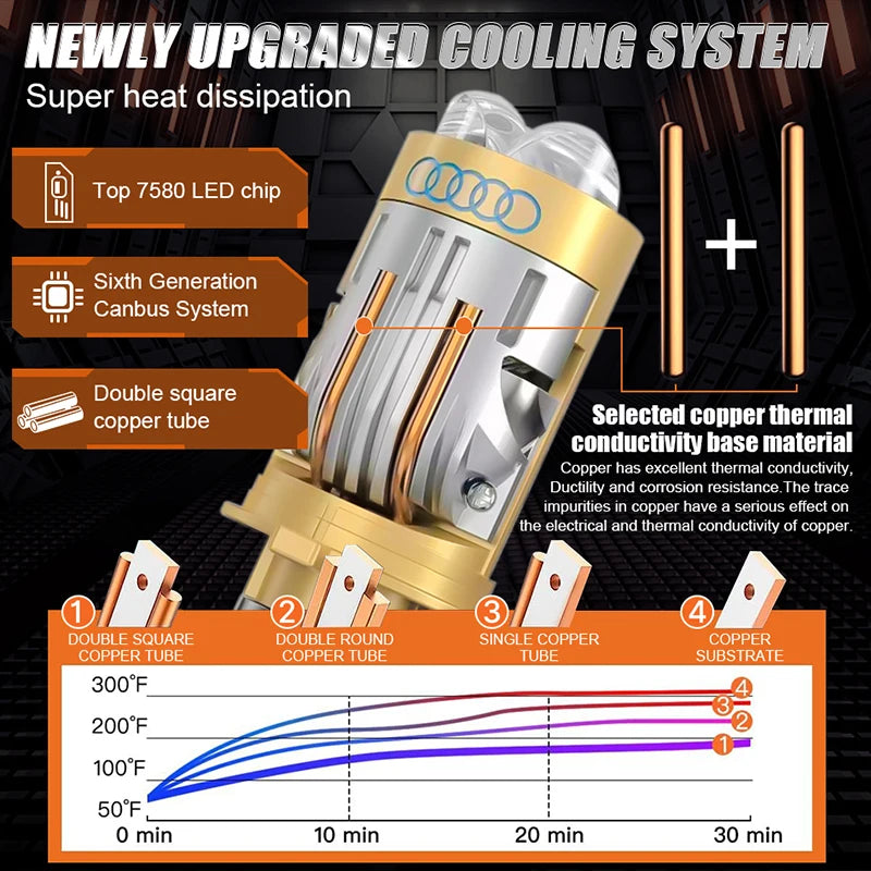- Advanced Heat Dissipation System: Our headlights come equipped with an exceptional heat dissipation system, utilizing a combination of copper pipes and high-powered fans to efficiently dissipate heat.