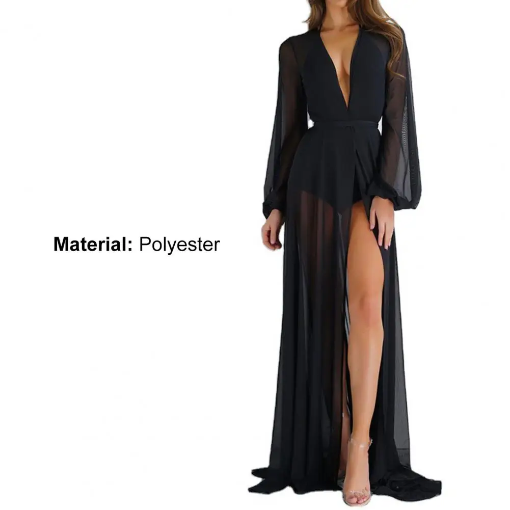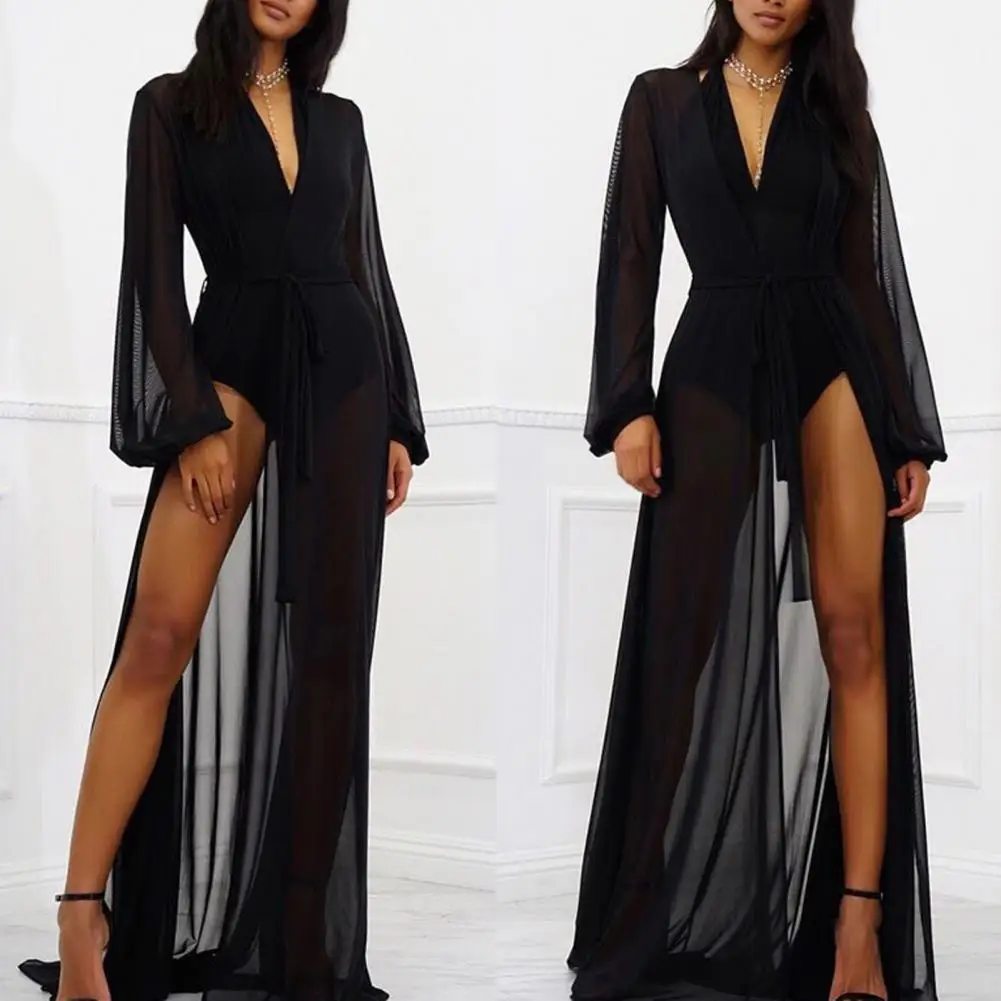 Deep V Neck Long Cardigan Sun Floor Length Ladies Cover up Sexy Lantern Sleeve Mesh Cardigan Beachwear For Outdoor