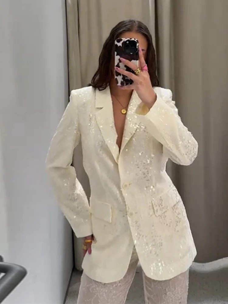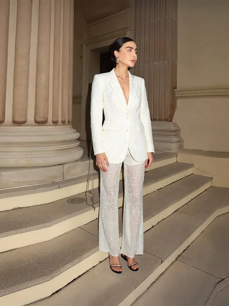 The suit is perfectly tailored, paired with sheer sequin pants that effectively modify the figure. It presents a capable and elegant temperament, highlighting confident charm, easily creating a high - end look, and displaying charming body curves.