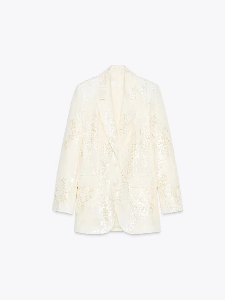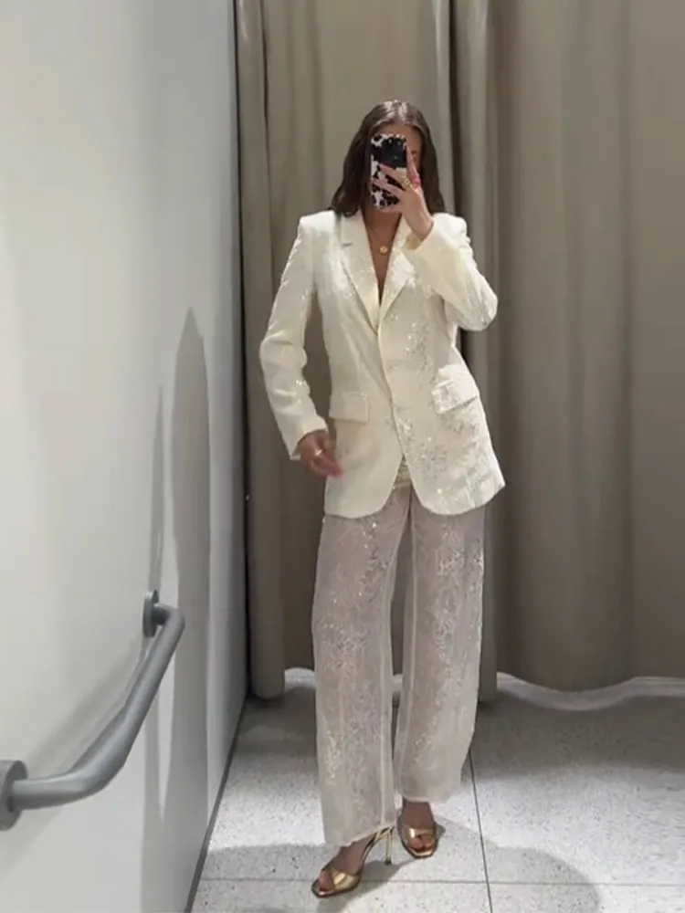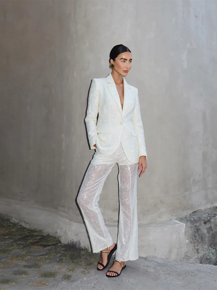 From the neat lines of the suit to the sequin arrangement on the sheer pants, every detail is meticulously handled, showcasing exquisite craftsmanship. The clever combination of sheer and sequins interprets a fashion - forward attitude, offering an excellent choice for those who pursue quality and fashion, and preserving stylish memories.